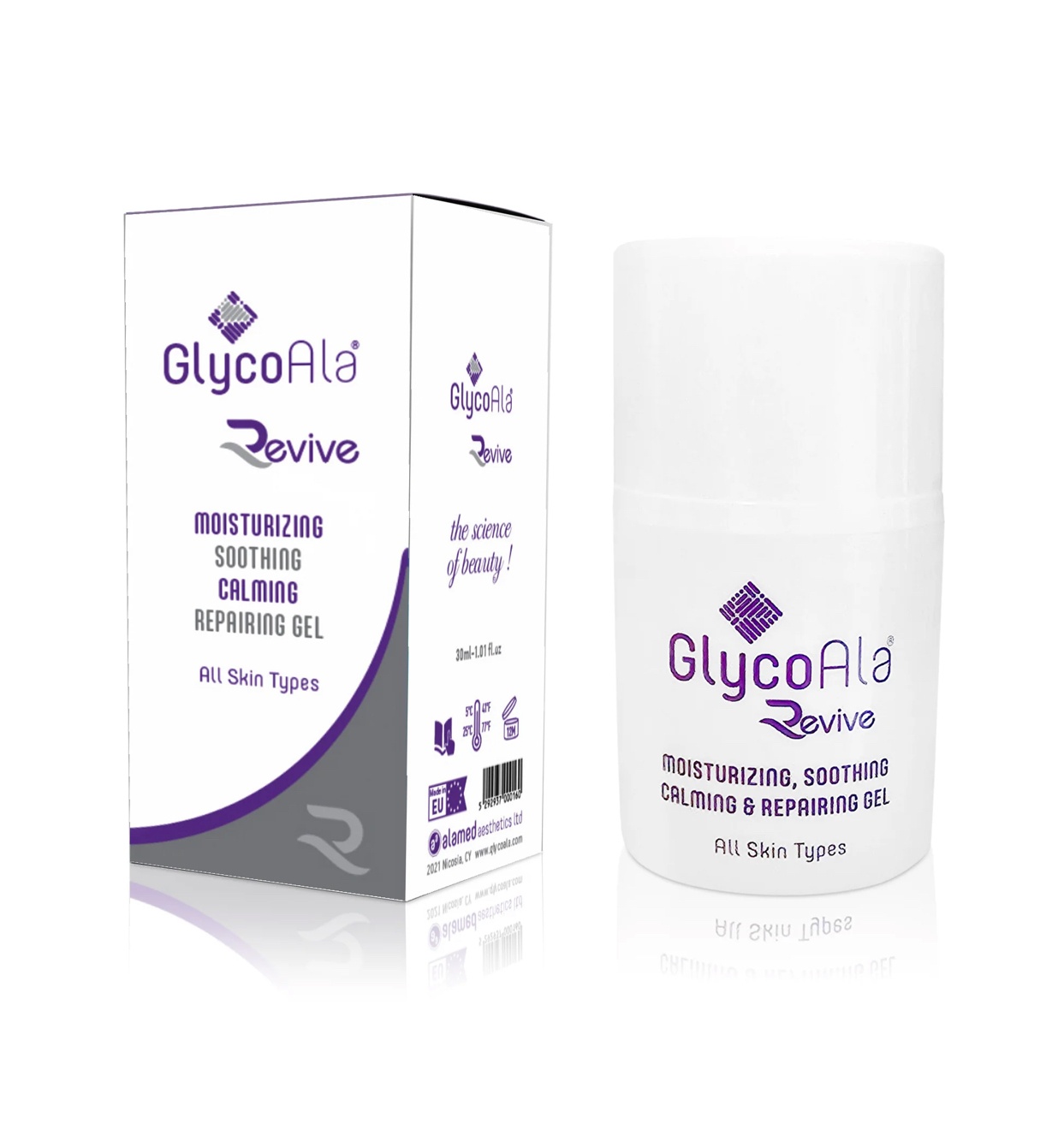 GlycoAla® Revive is an advanced, fast-absorbing gel designed to restore, hydrate, and protect the skin after professional treatments such as bio microneedling, microneedling, chemical peels, laser, or dermabrasion.